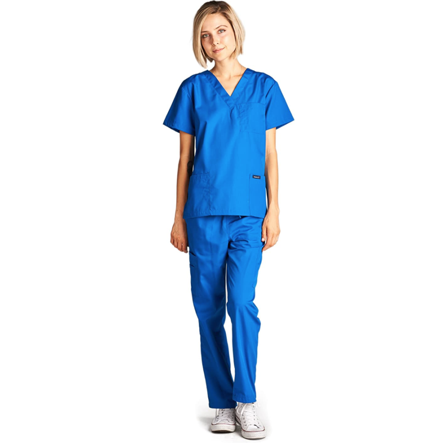 Dagacci Medical Uniform Unisex Scrubs Set - Woman and Man Classic Fit V-Neck Top, Three Side Cargo Pockets Pants.
