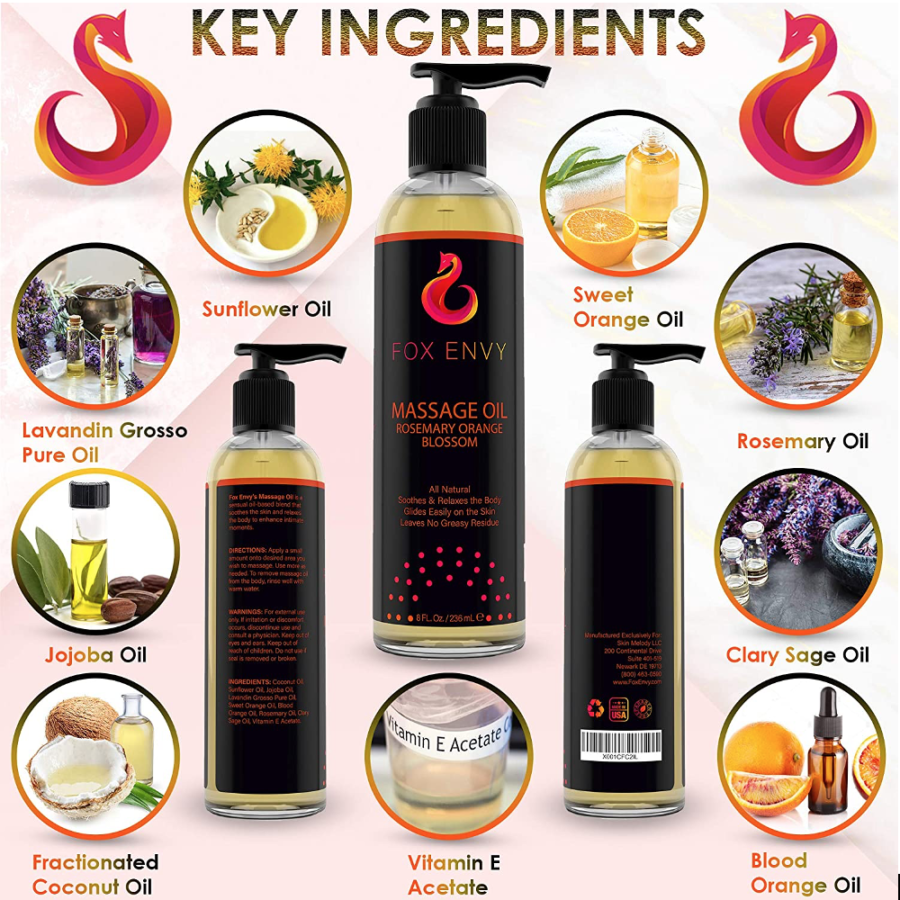 Rosemary Orange Scent for Added Aromatherapy - The Fox Envy Massage Oil - Orange Blossom with Rosemary is scented with a warm rosemary and orange fragrance that any single or couple will love to use, as it acts as a warmer and relaxant for the body and mind.