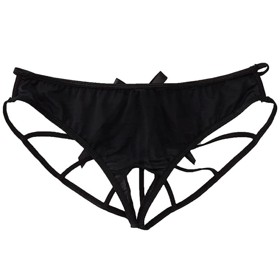 This drop-dead-sexy cage-back crotchless boyshort really frames your assets. Crotchless cage back boyshort. Features big black rear bow.