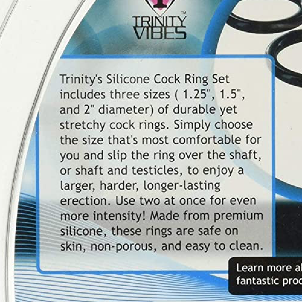 The Trinity Vibes Silicone Cock Ring Set offers three different sized cock rings. Not sure what size you need or what might feel most comfortable? Then this is an inexpensive way to find out!