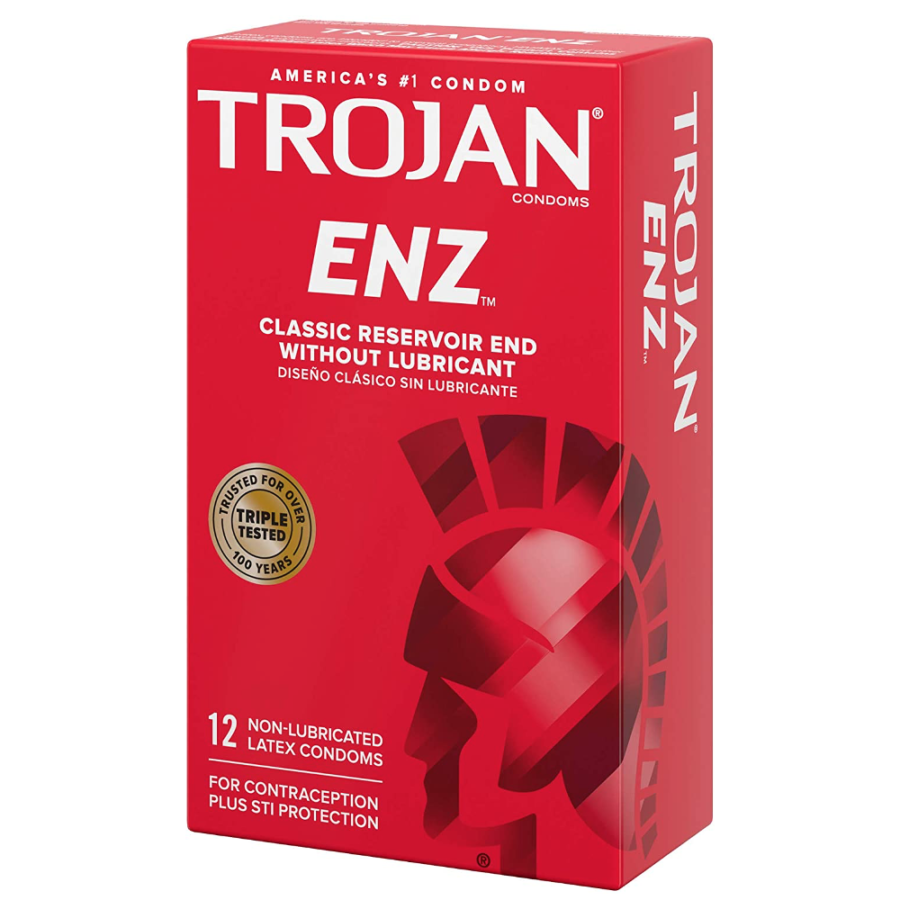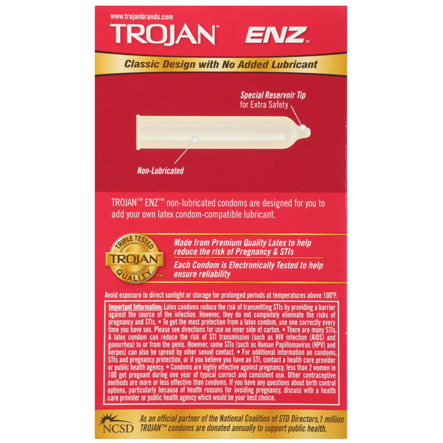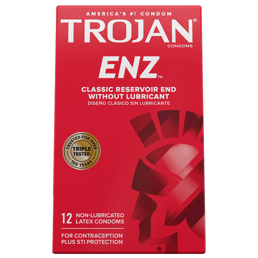 Includes one 12 count box of TROJAN ENZ Non-Lubricated Condoms. TROJAN Brand condoms are America's #1 condom, trusted for over 100 years. The TROJAN Brand promotes a safe, healthy, and fun sex life. From condoms to vibrators to lubricants, TROJAN Brand is dedicated to delivering innovative, high-quality products that offer pleasure and protection.