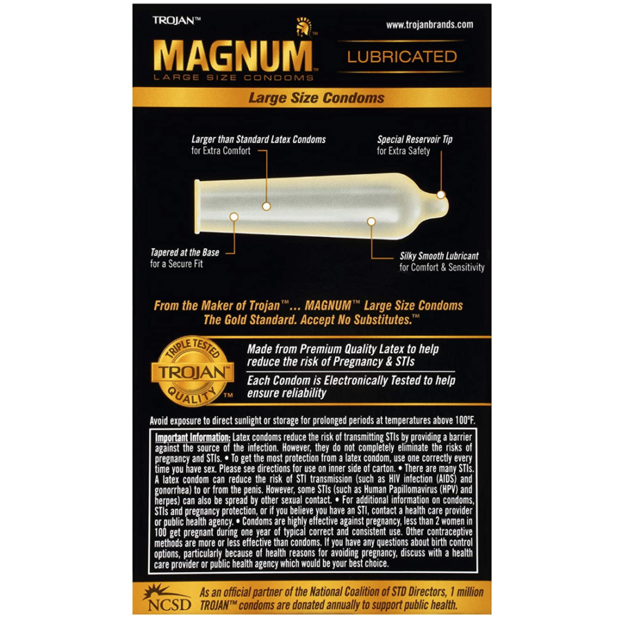 Designed for safety - Trusted for over 100 years, Trojan brand condoms are America's #1 condom. And for good reason. Their Magnum Large Size lubricated latex condoms feature a special reservoir tip for extra security, helping reduce the risk of unintended pregnancy and STIs, and they've also been triple-tested to help ensure reliability.