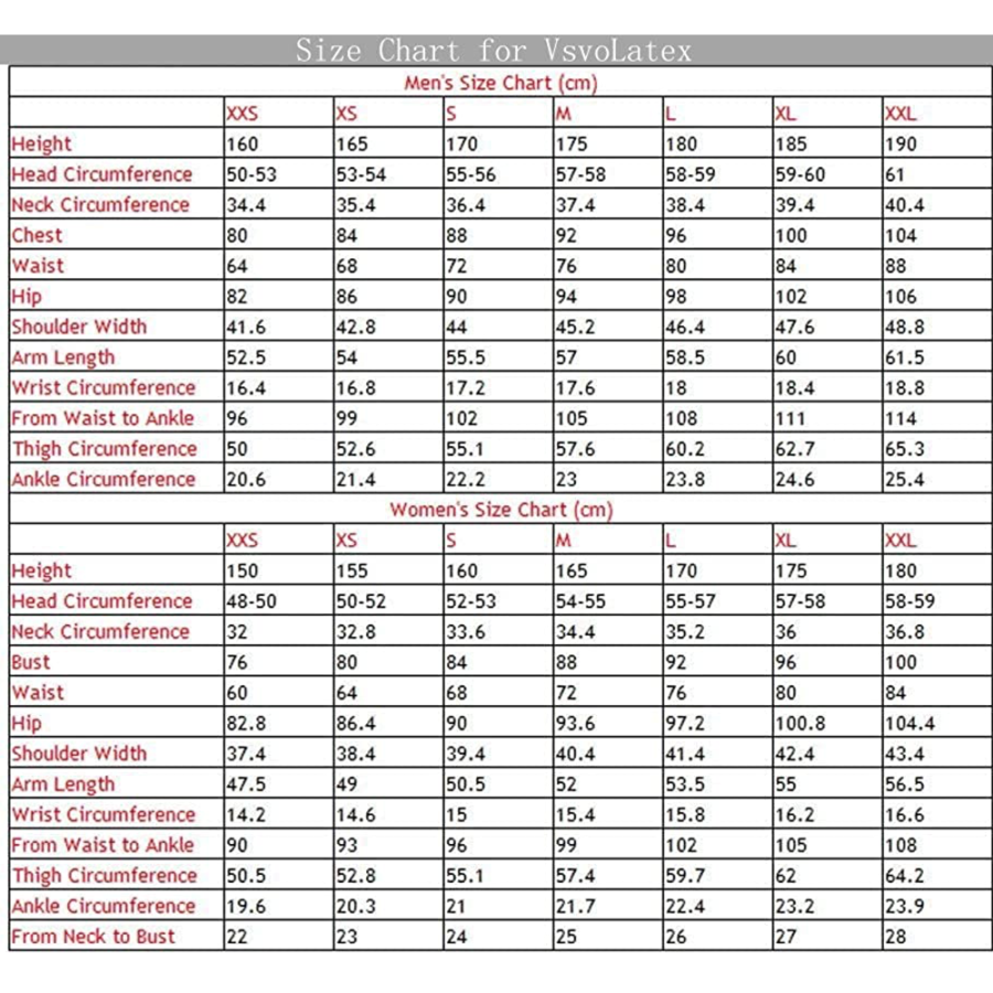 - XL: Height: 68.90",Neck Cir: 14.17", Bust: 37.80", Waist: 31.50", Hip: 39.69", Shoulder width: 16.69", Arm Legth: 21.65", Wrist Cir: 6.38", From Waist to Ankle: 41.34", Thigh Cir: 24.41", Ankle Cir: 9.13"